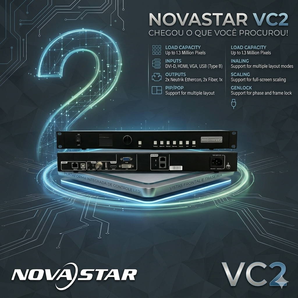 A NovaStar VC2 é a solução definitiva para quem busca praticidade, economia e alta performance em um único equipamento. Como uma controladora All-in-One, ela integra as funções de processamento de vídeo e cartão de envio (sending card), eliminando a necessidade de múltiplos aparelhos e simplificando drasticamente a instalação do seu painel de LED.